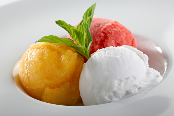 For a truly refreshing dessert we offer tropical flavors of sorbets that are frozen in fruit shells. The beautiful colors of the fruit and sorbet make this a winner. Your guests will have trouble choosing which one to eat.